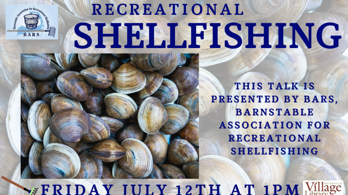 Let's learn all about recreational shellfishing with BARS, The Barnstable Association for Recreational Shelfishing! The purpose of BARS is to discuss issues relating to recreational shellfishing in the Town of Barnstable and to promote the welfare, propagation, conservation and protection of the existing shellfish habitats. They will be here at the Osterville Village Library sharing it all with us on Friday July 12th at 1pm. For more information or to register for this event, please contact Amy Wolfe at awolfe@clamsnet.org or call the Osterville Village Library directly at (508) 428-5757