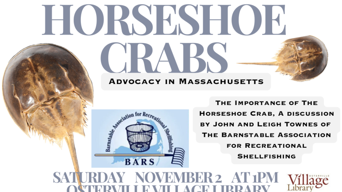The Osterville Village Library welcomes John and Leigh Townes of the Barnstable Association for Recreational Shellfishing with a lecture on the importance of Horseshoe Crabs. Let's learn all about these incredible sea creatures and the role they play in modern medicine and beyond!
