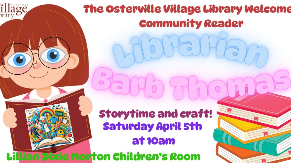 The Osterville Village Library welcomes Community Reader, Librarian Barb Thomas! Fun children's story time and craft!