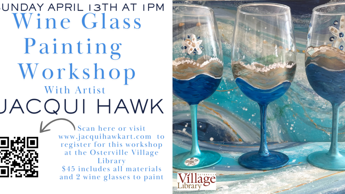 Artist Jacqui Hawk has a wine glass painting workshop at the Osterville Village Library on Sunday April 13th at 1pm in the Main Meeting Room at the Osterville Village Library! Visit www.jacquihawkart.com to register. This workshop is $45 and includes all materials including 2 wine glasses.