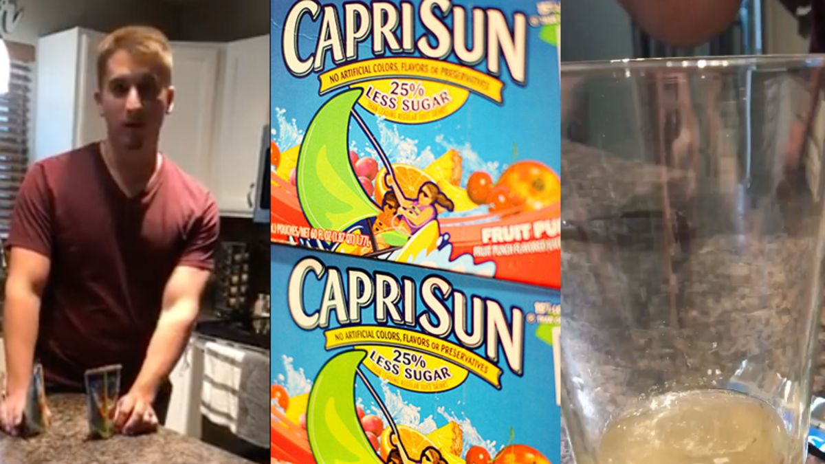 Cameron pours out the juice and in it seems to be some kind of mold. It's actually an issue Capri Sun is aware of. In the FAQ on their website, they note that the naturally occurring food mold is rare. They go on to say, "We care deeply about this issue and about the well-being of our moms, dads and kids. That's why we have invested millions of dollars in our packaging, quality and manufacturing processes to make our pouches even stronger and more resistant to air leaks. We recommend that parents gently squeeze each pouch to check for leaks before serving Capri Sun to their kids. Any leaky or punctured pouches should be discarded."