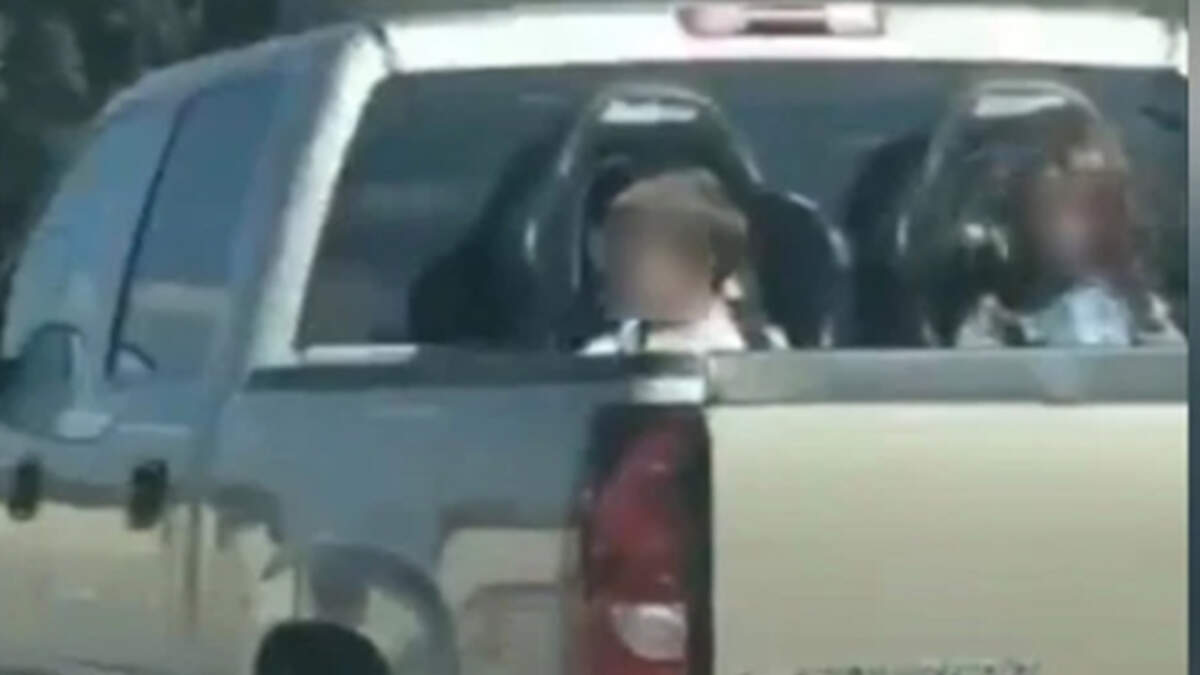 A driver was captured cruising down Route 54 in Wichita, Kansas with two young kids strapped in booster seats in the bed of their pickup truck. The wild scene was recorded by Dimitri Fernandez, who shared the video on Twitter.